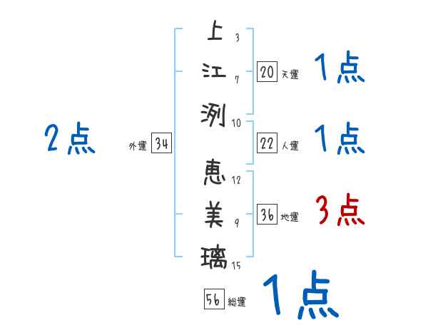 人運![]() | 上江洌恵美璃さんの人運は22画の1つ星!努力することが苦手ないっぽう手先が器用。芸術性にも優れる。 性格や才能などを表す2番目に重要な運勢です。人間関係や協調性、社会的な成功に影響します。主に20歳から50歳ぐらいまでの中年期の運勢を表します。 |