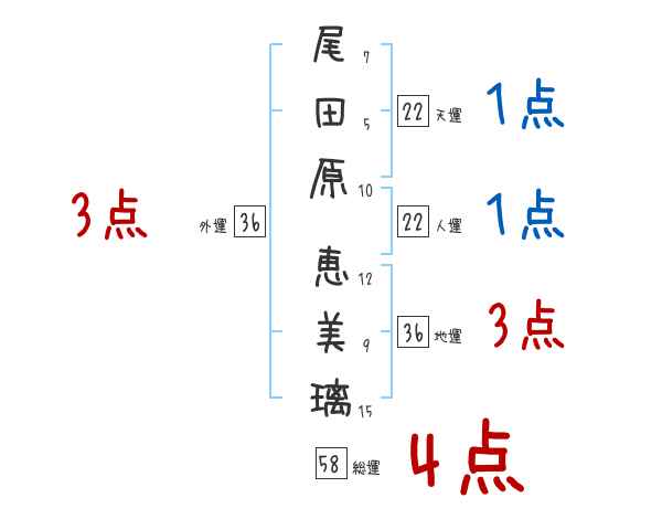 外運![]() | 尾田原恵美璃さんの外運は36画の3つ星!先見性が豊かです。多少神経質で苦労することも。 生活面を象徴する運勢です。外部から受ける影響力を表し、結婚運、家庭運や職場、環境への順応性を表します。 |
