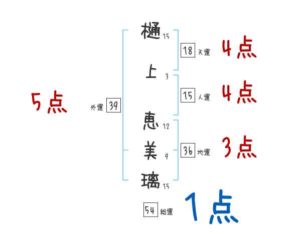 外運![]() | 樋上恵美璃さんの外運は39画の5つ星!社交性に優れ人望が厚い。人の上に立ち成功する。 生活面を象徴する運勢です。外部から受ける影響力を表し、結婚運、家庭運や職場、環境への順応性を表します。 |