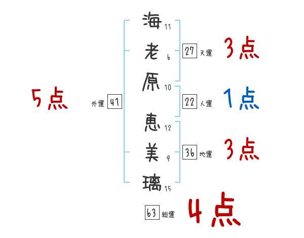 天運![]() | 海老原恵美璃さんの天運は27画の3つ星!頭脳明晰だが強情で摩擦が多い傾向。孤立に注意。 家系が持つ宿命的な運勢を表します。祖先から受け継いだ苗字ですので自分の力が及びません。家柄を象徴します。 |