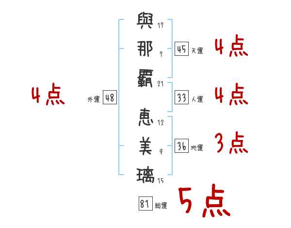 天運![]() | 與那覇恵美璃さんの天運は45画の4つ星!もくもくと物事を進め達成する。地味な努力家。 家系が持つ宿命的な運勢を表します。祖先から受け継いだ苗字ですので自分の力が及びません。家柄を象徴します。 |