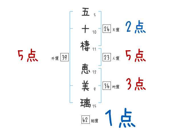 外運![]() | 五十棲恵美璃さんの外運は39画の5つ星!社交性に優れ人望が厚い。人の上に立ち成功する。 生活面を象徴する運勢です。外部から受ける影響力を表し、結婚運、家庭運や職場、環境への順応性を表します。 |