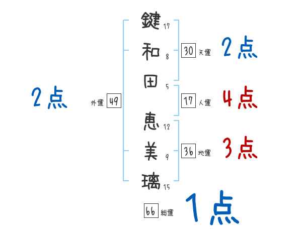 天運![]() | 鍵和田恵美璃さんの天運は30画の2つ星!浮き沈みの激しさに注意しましょう。 家系が持つ宿命的な運勢を表します。祖先から受け継いだ苗字ですので自分の力が及びません。家柄を象徴します。 |