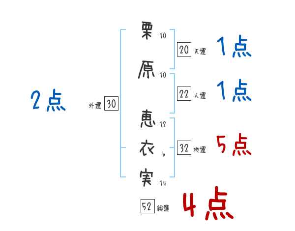 外運![]() | 栗原恵衣実さんの外運は30画の2つ星!浮き沈みの激しさに注意しましょう。 生活面を象徴する運勢です。外部から受ける影響力を表し、結婚運、家庭運や職場、環境への順応性を表します。 |