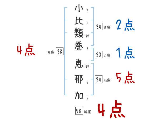 外運![]() | 小比類巻恵那加さんの外運は38画の4つ星!温厚な性格で技術的な才能を発揮する。職人的な仕事に向いている。 生活面を象徴する運勢です。外部から受ける影響力を表し、結婚運、家庭運や職場、環境への順応性を表します。 |