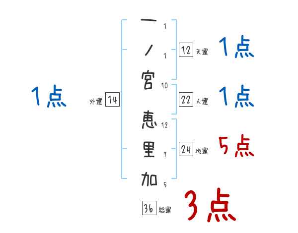 総運![]() | 一ノ宮恵里加さんの総運は36画の3つ星!先見性が豊かです。多少神経質で苦労することも。 あなたの人生を表す1番重要な運勢です。生涯を通じて影響する総合運となり、主に50歳以降の晩年期に影響を及ぼします。 |