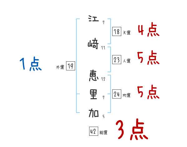 天運![]() | 江﨑恵里加さんの天運は18画の4つ星!情熱的で剛気。忍耐力があり信頼される。 家系が持つ宿命的な運勢を表します。祖先から受け継いだ苗字ですので自分の力が及びません。家柄を象徴します。 |