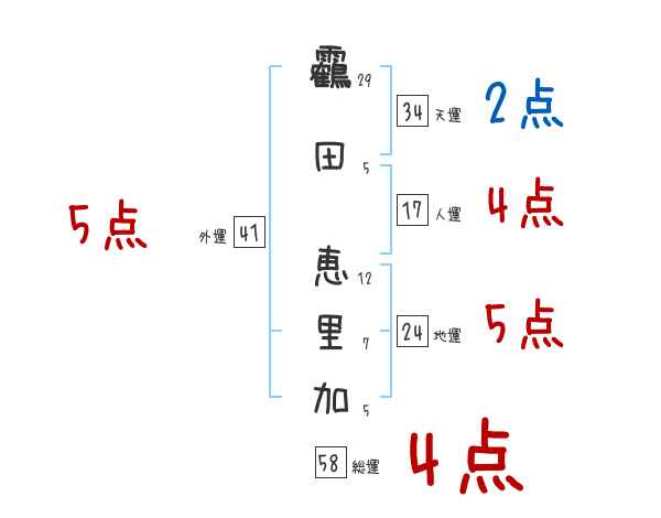 総運![]() | 靏田恵里加さんの総運は58画の4つ星!安定した生活。大器晩成タイプ。 あなたの人生を表す1番重要な運勢です。生涯を通じて影響する総合運となり、主に50歳以降の晩年期に影響を及ぼします。 |