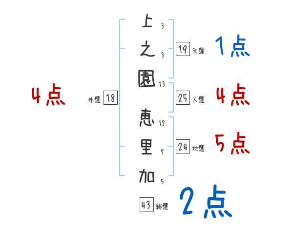 外運![]() | 上之園恵里加さんの外運は18画の4つ星!情熱的で剛気。忍耐力があり信頼される。 生活面を象徴する運勢です。外部から受ける影響力を表し、結婚運、家庭運や職場、環境への順応性を表します。 |