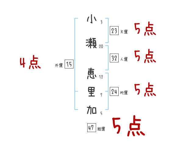 人運![]() | 小瀬恵里加さんの人運は32画の5つ星!柔軟性があり成功する。チャンスが多く金運が良い。 性格や才能などを表す2番目に重要な運勢です。人間関係や協調性、社会的な成功に影響します。主に20歳から50歳ぐらいまでの中年期の運勢を表します。 |