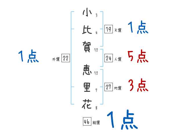 総運![]() | 小比賀恵里花さんの総運は46画の1つ星!迷走することが多く苦労するかも。目先のことにとらわれないように。 あなたの人生を表す1番重要な運勢です。生涯を通じて影響する総合運となり、主に50歳以降の晩年期に影響を及ぼします。 |