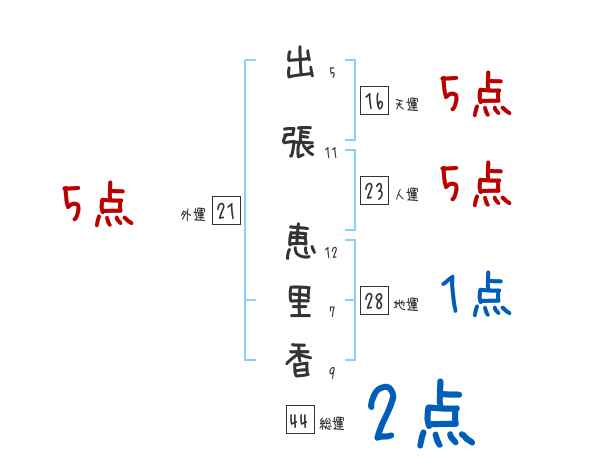 天運![]() | 出張恵里香さんの天運は16画の5つ星!人望が厚く大きく発展する。逆転成功が見える。 家系が持つ宿命的な運勢を表します。祖先から受け継いだ苗字ですので自分の力が及びません。家柄を象徴します。 |