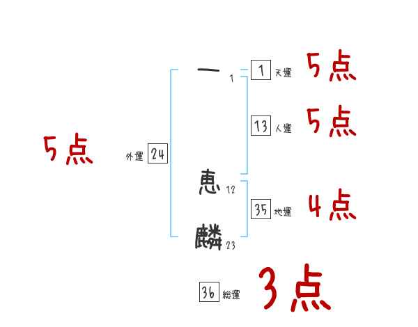 天運![]() | 一恵麟さんの天運は1画の5つ星!行動力、指導力があり出世し繁栄する。幸運に恵まれる。 家系が持つ宿命的な運勢を表します。祖先から受け継いだ苗字ですので自分の力が及びません。家柄を象徴します。 |