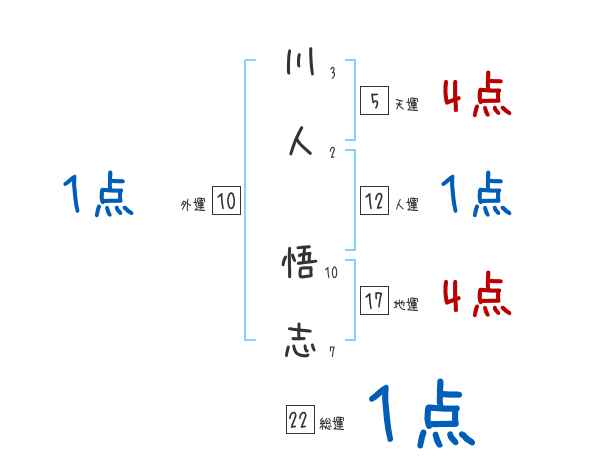 天運![]() | 川人悟志さんの天運は5画の4つ星!健康で安泰。協調性に優れ、財産に恵まれる。 家系が持つ宿命的な運勢を表します。祖先から受け継いだ苗字ですので自分の力が及びません。家柄を象徴します。 |