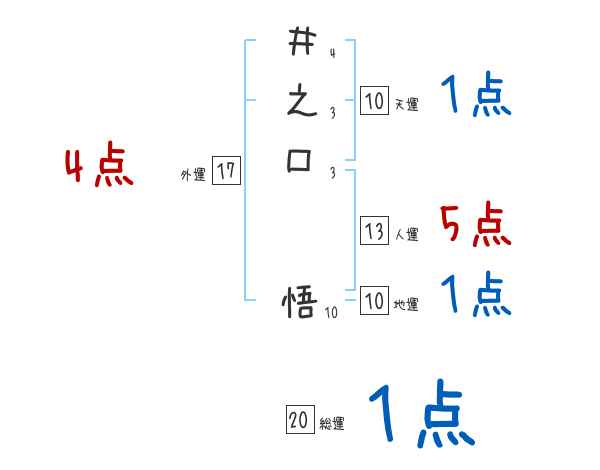 外運![]() | 井之口悟さんの外運は17画の4つ星!積極的な行動力。地位を気づき財産を手に入れる。純粋な心と直感力。 生活面を象徴する運勢です。外部から受ける影響力を表し、結婚運、家庭運や職場、環境への順応性を表します。 |
