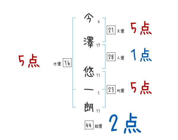 天運![]() | 今澤悠一朗さんの天運は21画の5つ星!統率力がある。独立し成功する。名誉を手に入れる。 家系が持つ宿命的な運勢を表します。祖先から受け継いだ苗字ですので自分の力が及びません。家柄を象徴します。 |