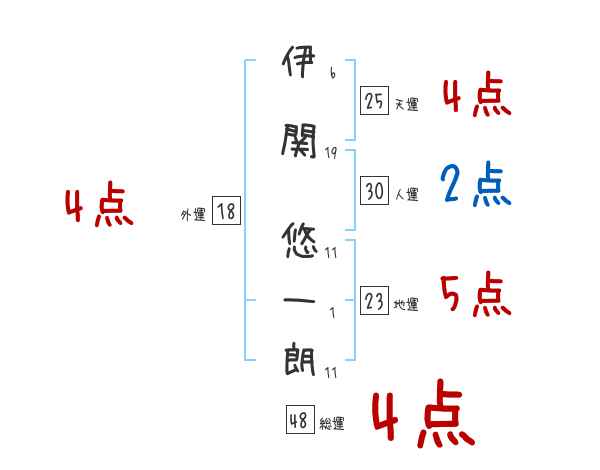 総運![]() | 伊関悠一朗さんの総運は48画の4つ星!賢明な性格で人望が厚い。指導力があり多くの人に尊敬される。 あなたの人生を表す1番重要な運勢です。生涯を通じて影響する総合運となり、主に50歳以降の晩年期に影響を及ぼします。 |