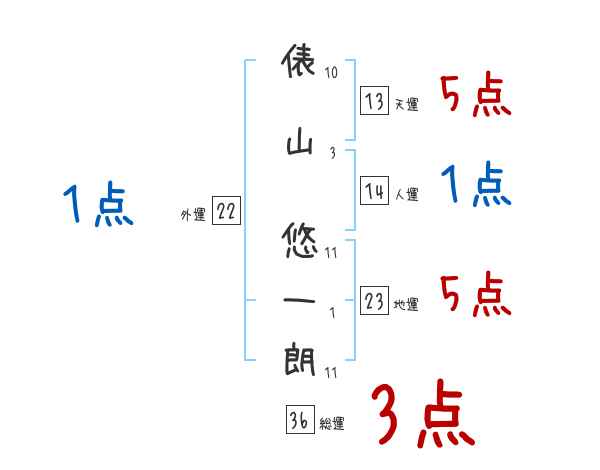 外運![]() | 俵山悠一朗さんの外運は22画の1つ星!努力することが苦手ないっぽう手先が器用。芸術性にも優れる。 生活面を象徴する運勢です。外部から受ける影響力を表し、結婚運、家庭運や職場、環境への順応性を表します。 |