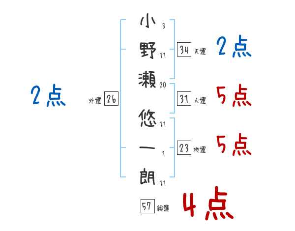 総運![]() | 小野瀬悠一朗さんの総運は57画の4つ星!向上心があり人望がある。地位を得る。 あなたの人生を表す1番重要な運勢です。生涯を通じて影響する総合運となり、主に50歳以降の晩年期に影響を及ぼします。 |