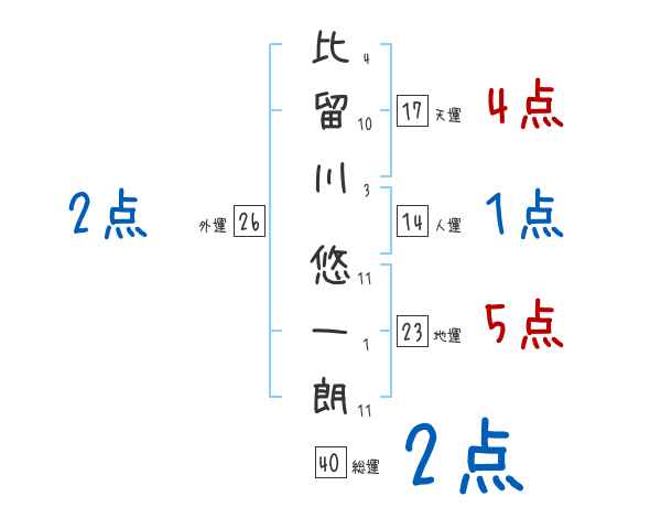 外運![]() | 比留川悠一朗さんの外運は26画の2つ星!波瀾万丈かも。信頼できる人を大事にしましょう。 生活面を象徴する運勢です。外部から受ける影響力を表し、結婚運、家庭運や職場、環境への順応性を表します。 |