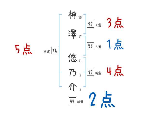 外運![]() | 神澤悠乃介さんの外運は16画の5つ星!人望が厚く大きく発展する。逆転成功が見える。 生活面を象徴する運勢です。外部から受ける影響力を表し、結婚運、家庭運や職場、環境への順応性を表します。 |