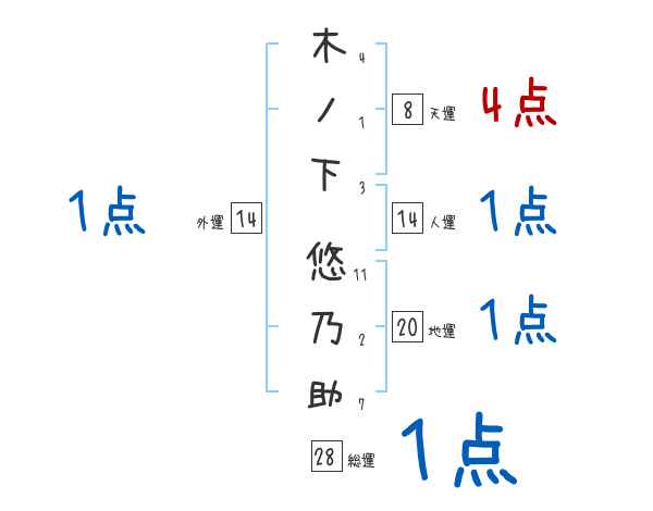 総運![]() | 木ノ下悠乃助さんの総運は28画の1つ星!家庭環境に注意。スポーツで活躍できる能力があるかも。 あなたの人生を表す1番重要な運勢です。生涯を通じて影響する総合運となり、主に50歳以降の晩年期に影響を及ぼします。 |