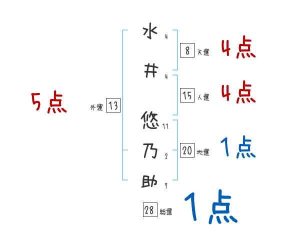 総運![]() | 水井悠乃助さんの総運は28画の1つ星!家庭環境に注意。スポーツで活躍できる能力があるかも。 あなたの人生を表す1番重要な運勢です。生涯を通じて影響する総合運となり、主に50歳以降の晩年期に影響を及ぼします。 |