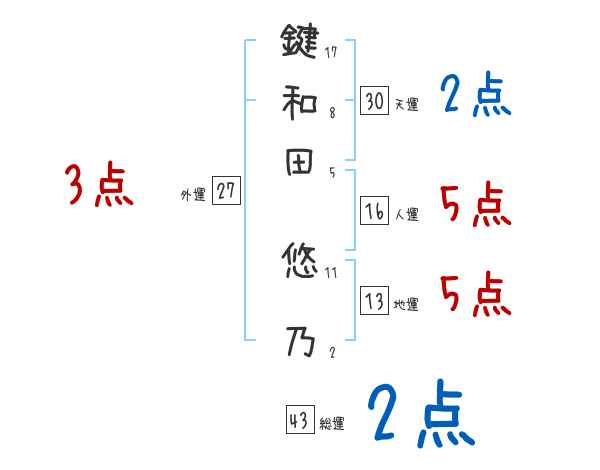 総運![]() | 鍵和田悠乃さんの総運は43画の2つ星!頑固な性格で独立心が強いかも。やや非現実的で浪費に注意しましょう。 あなたの人生を表す1番重要な運勢です。生涯を通じて影響する総合運となり、主に50歳以降の晩年期に影響を及ぼします。 |