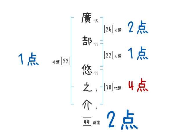 総運![]() | 廣部悠之介さんの総運は44画の2つ星!誠実で慎重な性格。物事を考えすぎないように注意しましょう。 あなたの人生を表す1番重要な運勢です。生涯を通じて影響する総合運となり、主に50歳以降の晩年期に影響を及ぼします。 |