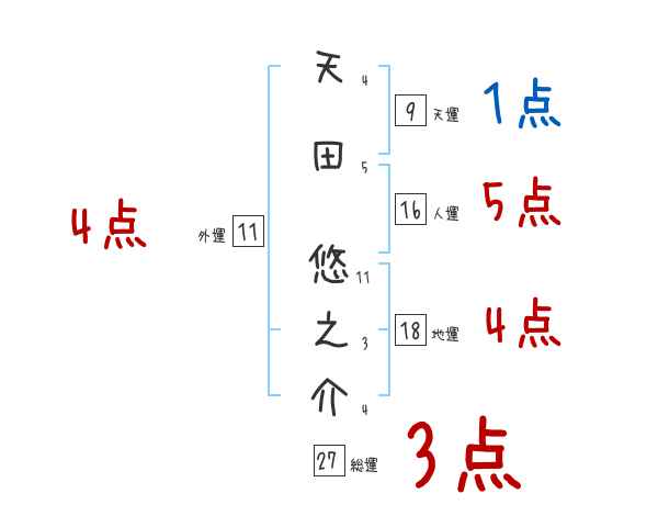 人運![]() | 天田悠之介さんの人運は16画の5つ星!人望が厚く大きく発展する。逆転成功が見える。 性格や才能などを表す2番目に重要な運勢です。人間関係や協調性、社会的な成功に影響します。主に20歳から50歳ぐらいまでの中年期の運勢を表します。 |