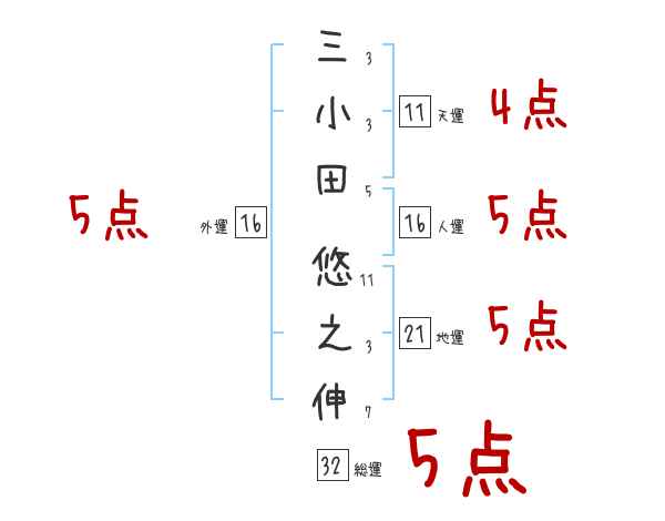 外運![]() | 三小田悠之伸さんの外運は16画の5つ星!人望が厚く大きく発展する。逆転成功が見える。 生活面を象徴する運勢です。外部から受ける影響力を表し、結婚運、家庭運や職場、環境への順応性を表します。 |