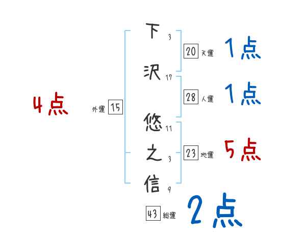 総運![]() | 下沢悠之信さんの総運は43画の2つ星!頑固な性格で独立心が強いかも。やや非現実的で浪費に注意しましょう。 あなたの人生を表す1番重要な運勢です。生涯を通じて影響する総合運となり、主に50歳以降の晩年期に影響を及ぼします。 |