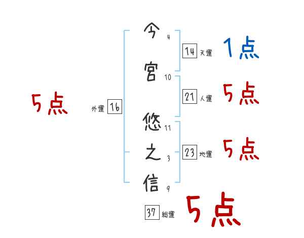 外運![]() | 今宮悠之信さんの外運は16画の5つ星!人望が厚く大きく発展する。逆転成功が見える。 生活面を象徴する運勢です。外部から受ける影響力を表し、結婚運、家庭運や職場、環境への順応性を表します。 |