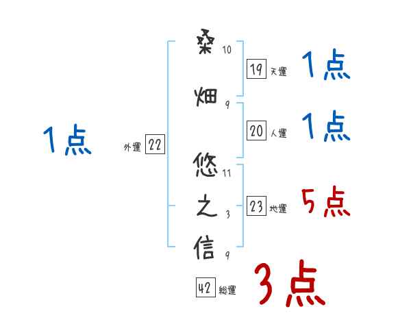 天運![]() | 桑畑悠之信さんの天運は19画の1つ星!優れた才能を持ちますが、協調性が足りないことも。周りの人と協力する事を意識しましょう。 家系が持つ宿命的な運勢を表します。祖先から受け継いだ苗字ですので自分の力が及びません。家柄を象徴します。 |