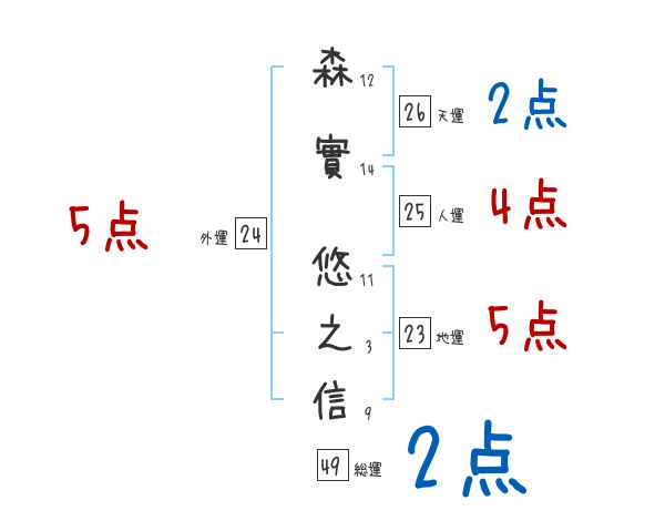外運![]() | 森實悠之信さんの外運は24画の5つ星!家庭運が良く順調な人生。金運にも恵まれる。 生活面を象徴する運勢です。外部から受ける影響力を表し、結婚運、家庭運や職場、環境への順応性を表します。 |