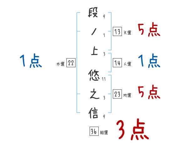 総運![]() | 段ノ上悠之信さんの総運は36画の3つ星!先見性が豊かです。多少神経質で苦労することも。 あなたの人生を表す1番重要な運勢です。生涯を通じて影響する総合運となり、主に50歳以降の晩年期に影響を及ぼします。 |