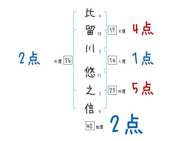 天運![]() | 比留川悠之信さんの天運は17画の4つ星!積極的な行動力。地位を気づき財産を手に入れる。純粋な心と直感力。 家系が持つ宿命的な運勢を表します。祖先から受け継いだ苗字ですので自分の力が及びません。家柄を象徴します。 |