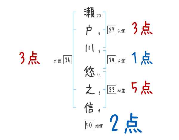 総運![]() | 瀬戸川悠之信さんの総運は50画の2つ星!浮き沈みが激しく不安定。しりすぼみに衰退しやすいので注意しましょう。 あなたの人生を表す1番重要な運勢です。生涯を通じて影響する総合運となり、主に50歳以降の晩年期に影響を及ぼします。 |