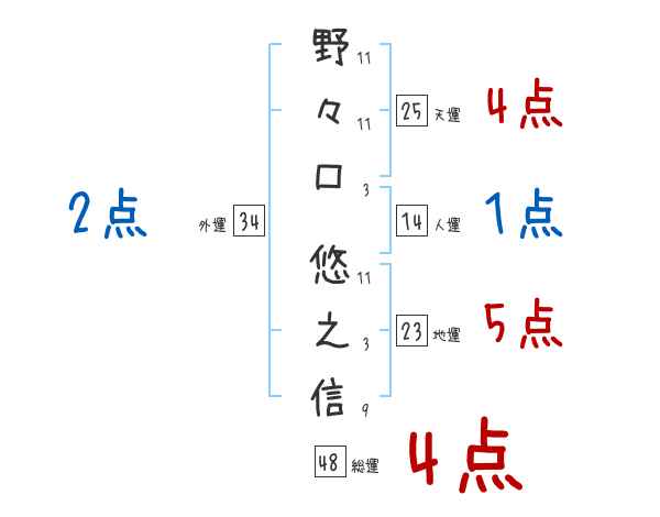 外運![]() | 野々口悠之信さんの外運は34画の2つ星!独創性に優れるが、自尊心が強く災難に注意しましょう。 生活面を象徴する運勢です。外部から受ける影響力を表し、結婚運、家庭運や職場、環境への順応性を表します。 |
