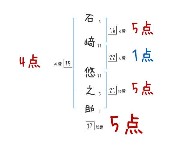外運![]() | 石﨑悠之助さんの外運は15画の4つ星!人徳があり出世する。順調に物事を進め円満な人生。 生活面を象徴する運勢です。外部から受ける影響力を表し、結婚運、家庭運や職場、環境への順応性を表します。 |