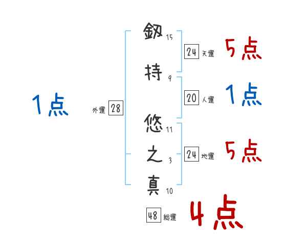 外運![]() | 釼持悠之真さんの外運は28画の1つ星!家庭環境に注意。スポーツで活躍できる能力があるかも。 生活面を象徴する運勢です。外部から受ける影響力を表し、結婚運、家庭運や職場、環境への順応性を表します。 |