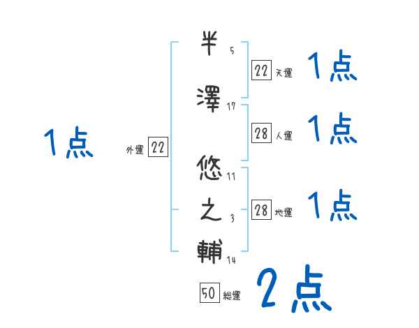 外運![]() | 半澤悠之輔さんの外運は22画の1つ星!努力することが苦手ないっぽう手先が器用。芸術性にも優れる。 生活面を象徴する運勢です。外部から受ける影響力を表し、結婚運、家庭運や職場、環境への順応性を表します。 |