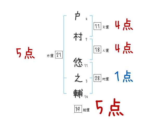 総運![]() | 戸村悠之輔さんの総運は39画の5つ星!社交性に優れ人望が厚い。人の上に立ち成功する。 あなたの人生を表す1番重要な運勢です。生涯を通じて影響する総合運となり、主に50歳以降の晩年期に影響を及ぼします。 |