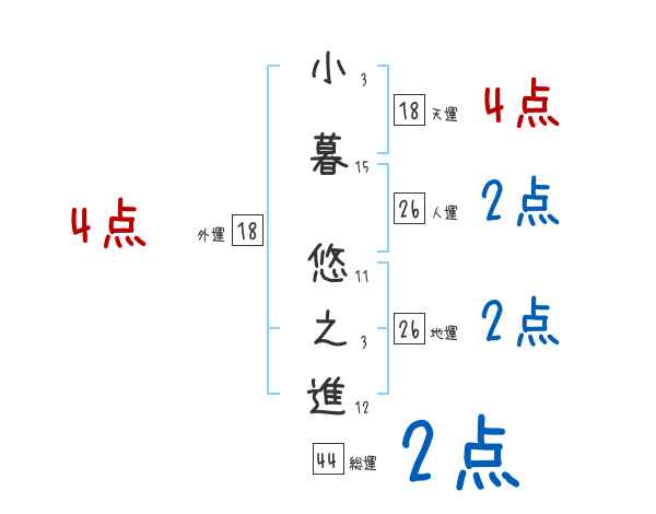 天運![]() | 小暮悠之進さんの天運は18画の4つ星!情熱的で剛気。忍耐力があり信頼される。 家系が持つ宿命的な運勢を表します。祖先から受け継いだ苗字ですので自分の力が及びません。家柄を象徴します。 |