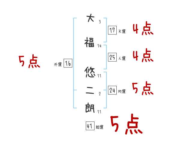 外運![]() | 大福悠二朗さんの外運は16画の5つ星!人望が厚く大きく発展する。逆転成功が見える。 生活面を象徴する運勢です。外部から受ける影響力を表し、結婚運、家庭運や職場、環境への順応性を表します。 |