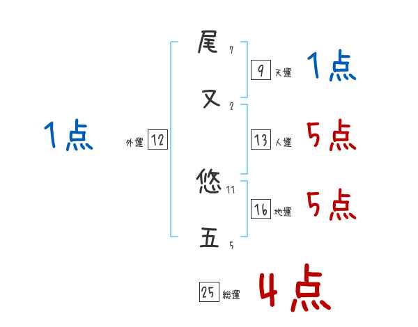 総運![]() | 尾又悠五さんの総運は25画の4つ星!個性があり才能があふれる。強運の持ち主で発展する。 あなたの人生を表す1番重要な運勢です。生涯を通じて影響する総合運となり、主に50歳以降の晩年期に影響を及ぼします。 |