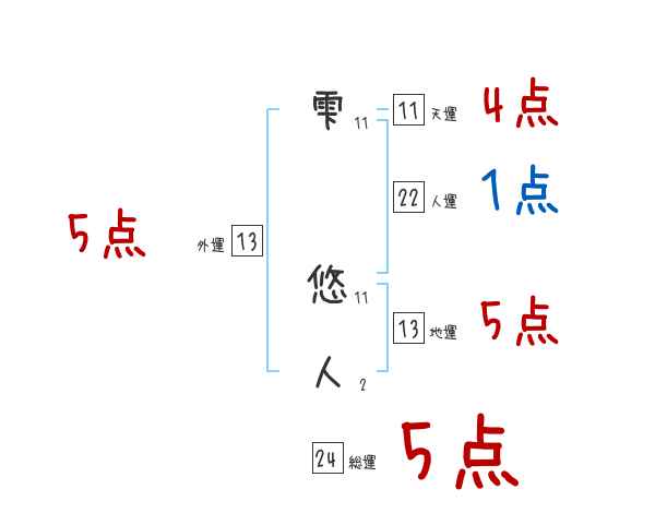 外運![]() | 雫悠人さんの外運は13画の5つ星!才能に恵まれ人気がある。名声を手に入れる。円満な人生。 生活面を象徴する運勢です。外部から受ける影響力を表し、結婚運、家庭運や職場、環境への順応性を表します。 |