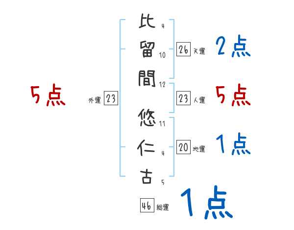 総運![]() | 比留間悠仁古さんの総運は46画の1つ星!迷走することが多く苦労するかも。目先のことにとらわれないように。 あなたの人生を表す1番重要な運勢です。生涯を通じて影響する総合運となり、主に50歳以降の晩年期に影響を及ぼします。 |