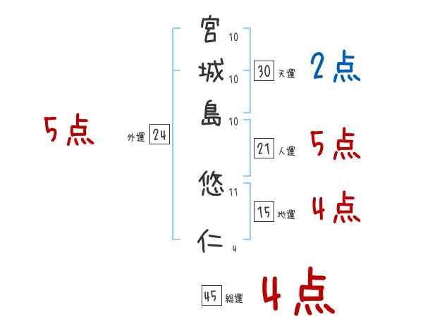 総運![]() | 宮城島悠仁さんの総運は45画の4つ星!もくもくと物事を進め達成する。地味な努力家。 あなたの人生を表す1番重要な運勢です。生涯を通じて影響する総合運となり、主に50歳以降の晩年期に影響を及ぼします。 |