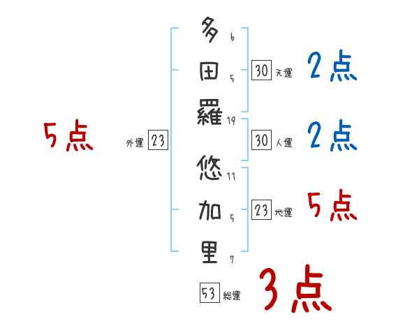 天運![]() | 多田羅悠加里さんの天運は30画の2つ星!浮き沈みの激しさに注意しましょう。 家系が持つ宿命的な運勢を表します。祖先から受け継いだ苗字ですので自分の力が及びません。家柄を象徴します。 |
